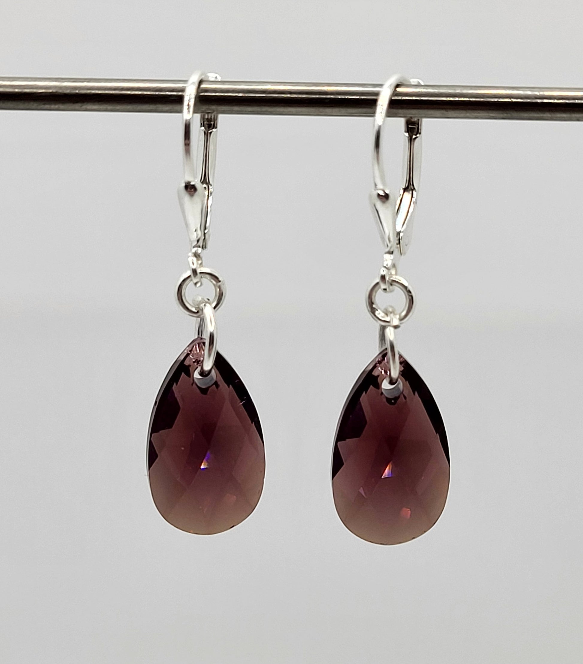Sterling Silver Earrings - Swarovski Crystal Amethyst Moonlight Pear Pendants; LAST ONE